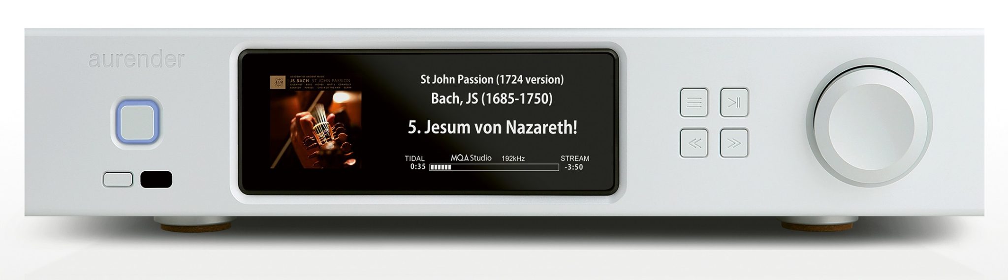 Connectivity with Versatility The A15 can function as a source or a preamplifier with volume control and digital source selection. It can be connected directly to any power amplifier or an active loudspeaker system for the utmost simplicity. Volume control, and other playback actions, can be adjusted from the Aurender Conductor app or included machined-aluminum IR remote control. If you already use a preamplifier or integrated amp, the variable output can be set to “Direct Output” mode for a fixed output level with no volume attenuation. The front panel buttons also provide an interface to adjust volume, play / pause / skip track, as well as select and start a created playlist.