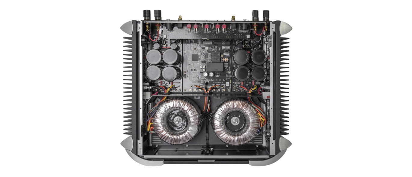 De 761-voeding bevat twee op maat gemaakte geluidsarme 700 VA-transformatoren met een capaciteit van 152.000 uF en halfgeleiders van superieure kwaliteit, waardoor consistente prestaties worden gegarandeerd. Deze dual-mono versterker genereert 200 W per kanaal in 8 ohm in stereo, verdubbelt in 4 ohm, en heeft een schakelaar om de versterkers te overbruggen en 600 W in een 8 ohm belasting te sturen als een monoblok. De MDCA (MOON Distortion-Cancelling Amplifier) ‚‚bouwt voort op de ontwerpfilosofie om wereldwijde feedback te mijden met een nieuw circuit dat vervorming en ruis reduceert tot voorheen onbereikbare niveaus.
