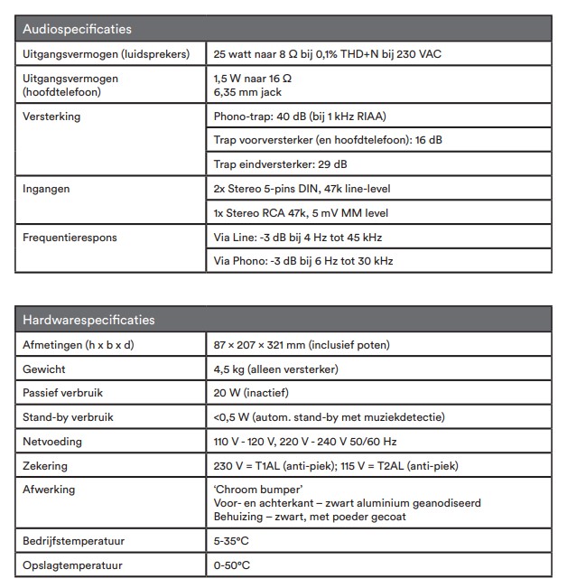 De 2 x 25 watt bij 8 Ohm kan worden ingezet voor, MM phono stage (rca gnd), Streaming (din5), en aux (din5). Nieuw is ook de 3,35 koptelefoon aansluiting. Uit deklassieke������modern vormgegeven unit, Komt een vertrouwd dynamisch geluid.