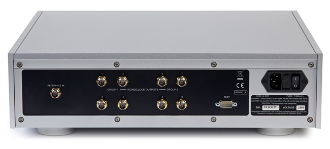 - Word Clock-uitgangen: twee groepen van 4 onafhankelijk gebufferde uitgangen op 75Ω BNC-connectoren. Elke groep kan op een andere klokfrequentie worden ingesteld.